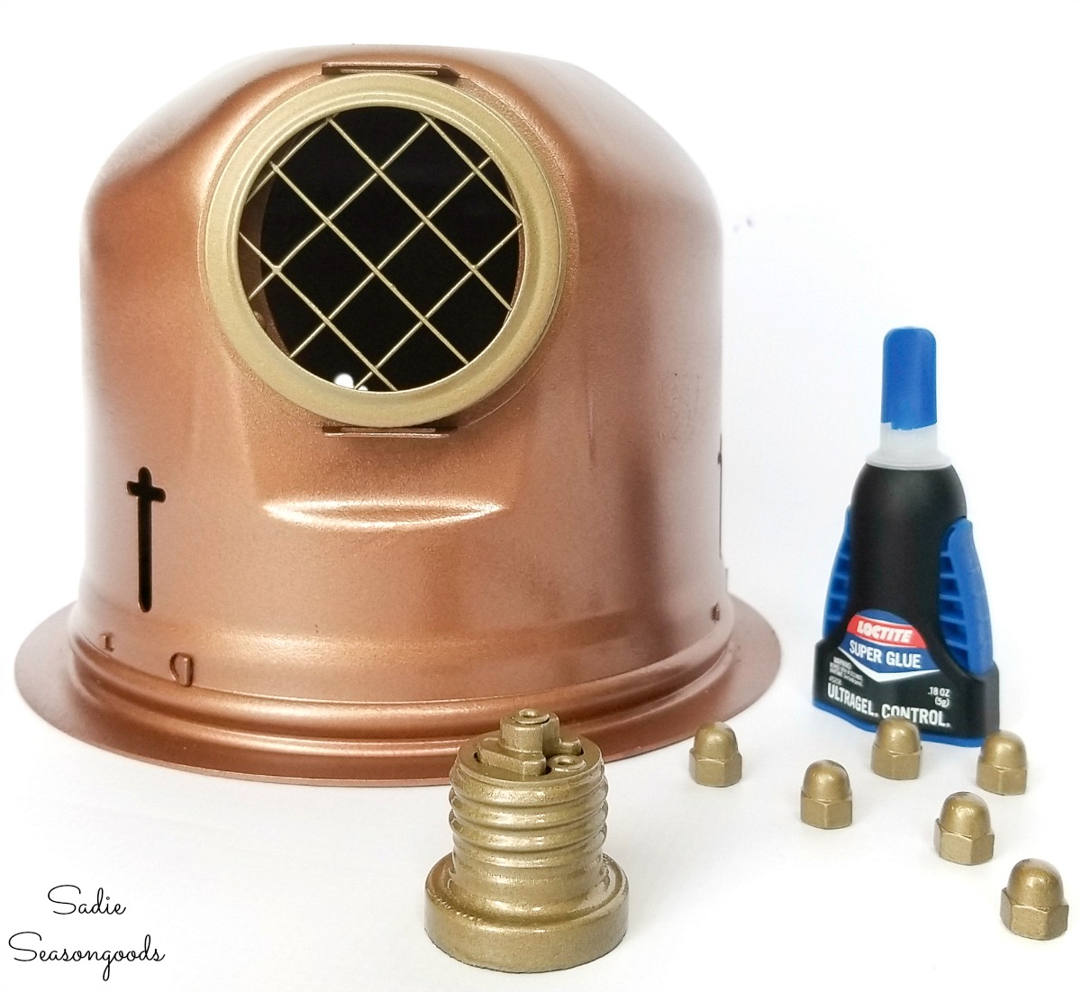 You could use hot glue if you wanted to, but I really wanted the strength of super glue. The light socket and cap nuts, especially, were heavier and I needed to make sure my glue of choice would hold them firmly on the old diving helmet.