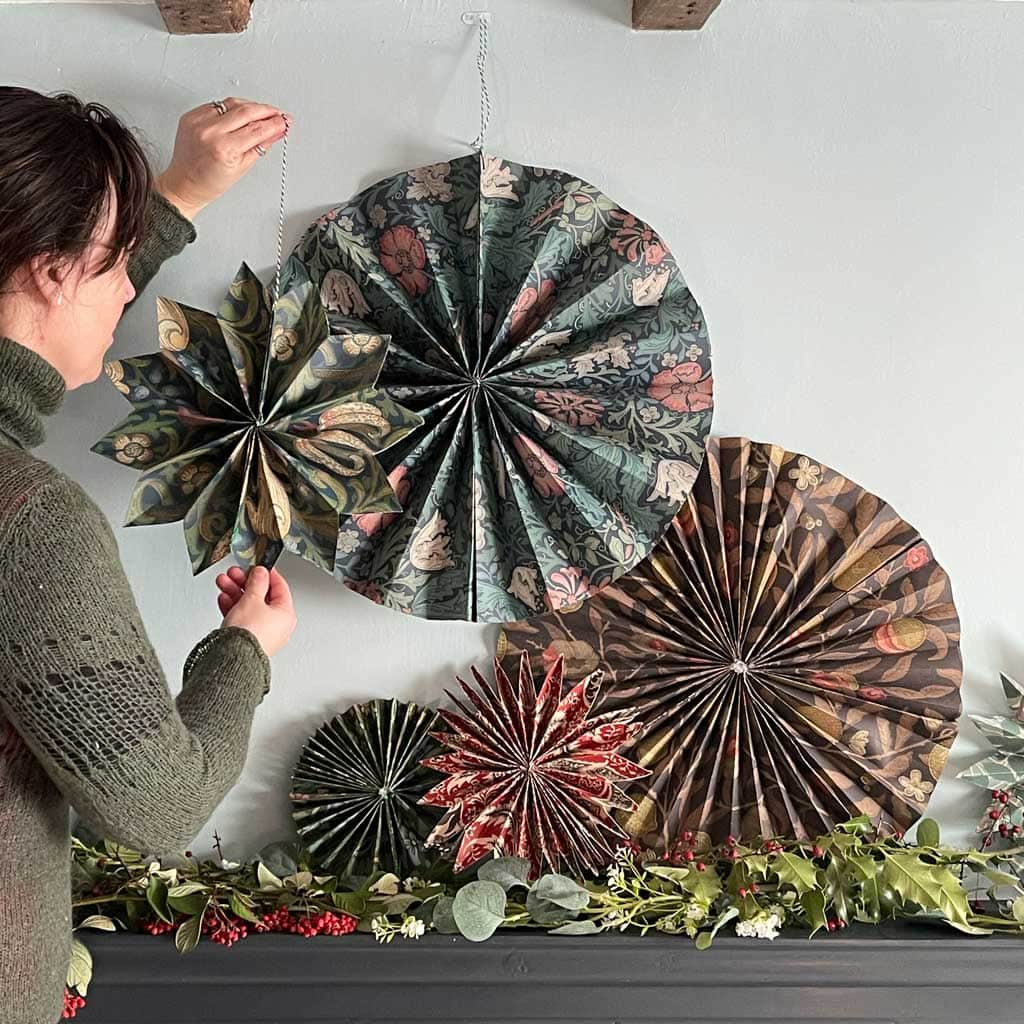 Round paper fan decorations can be made with colored craft paper, wrapping paper, and even scraps of left-over wallpaper. Make a batch of differing sizes and group together for maximum impact.