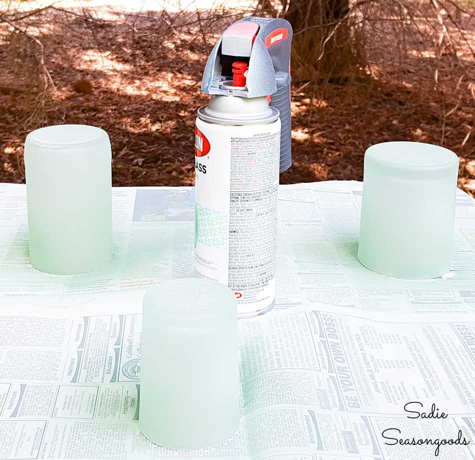 After the sea glass spray paint dried, I gave the the glass candle holders two light coats of matte sealant. Sea glass spray paint has a tendency to scratch easily if not sealed. And I still needed to replace the chicken wire sleeves on them!