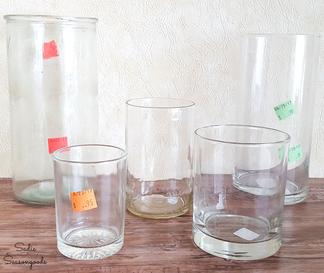 Gorgeous beach themed decor and coastal farmhouse decor! And all from those glass candle holders that you find at just about any thrift store.