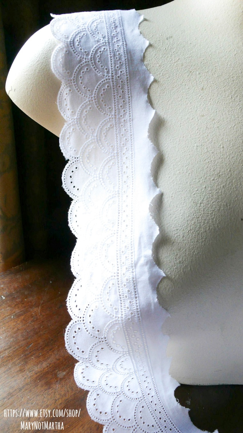 First things first, I headed to Etsy. There, I purchased some gorgeous vintage eyelet trim (from this shop) that would act as snow.