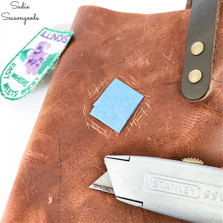 Once the patches were taped, I carefully peeled off a patch one at a time and used a utility knife to score and scratch the leather’s surface. The leather needed to be roughed up in order for the glue to do its job…