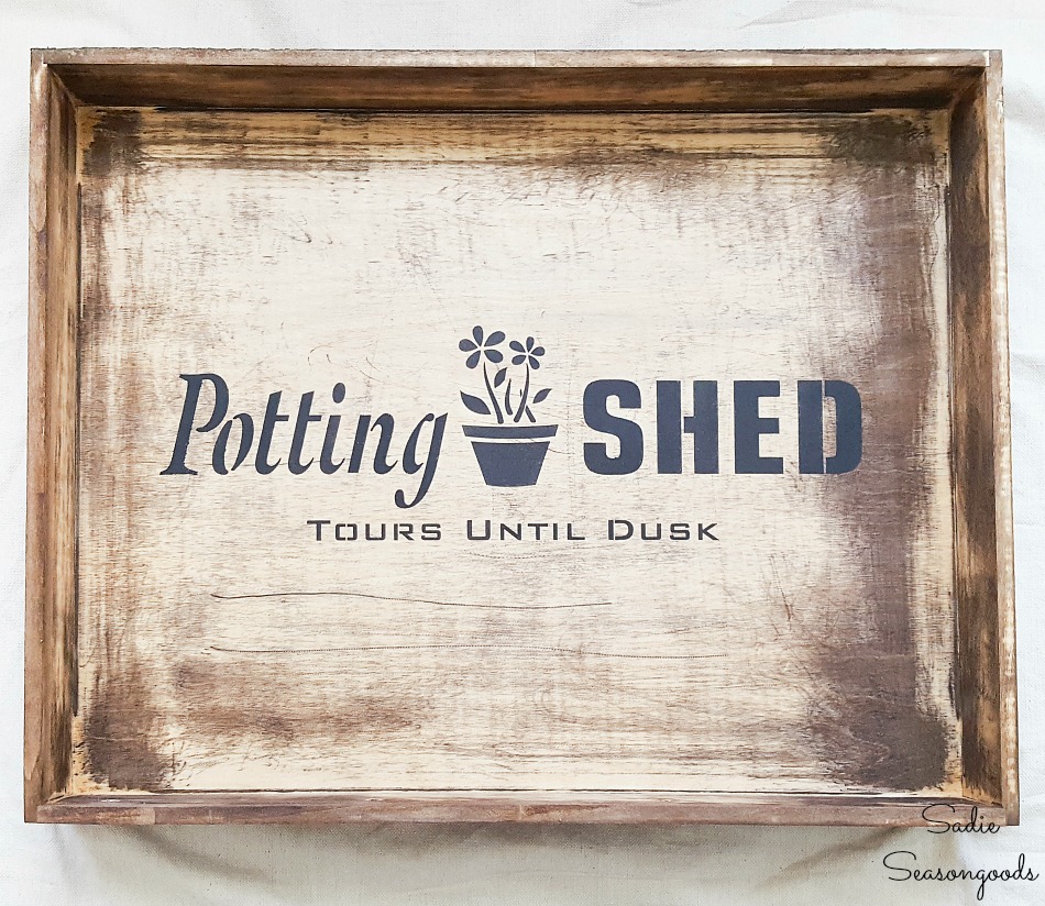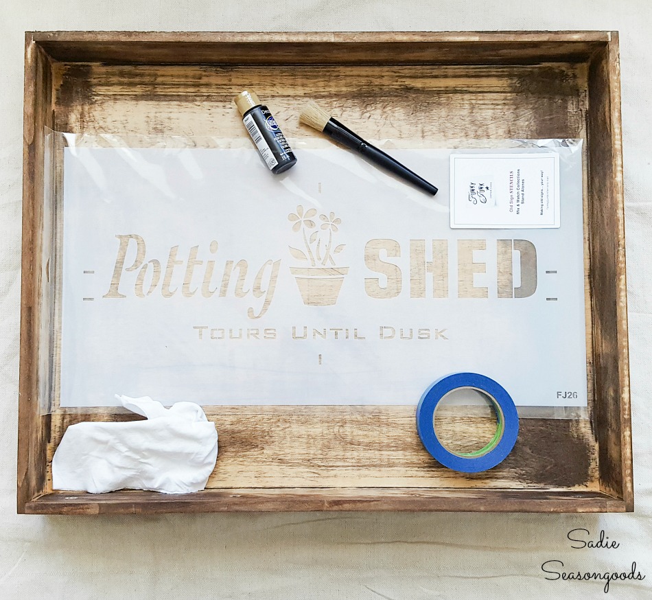 Using a gorgeous potting shed stencil from Funky Junk’s Old Sign Stencils, I set up stenciling shop.