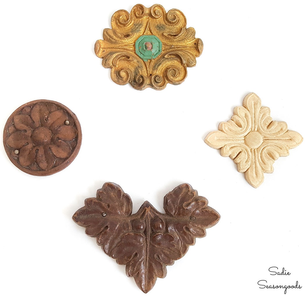 For two years now, I’ve had a bag of wood medallions for furniture (also known as wood medallion appliques) just sitting in my craft room. I purchased them at an architectural antiques store in Nashville, TN because they seemed PERFECT for a future project. At the time, I didn’t know what I’d do with them. Until I started envisioning them as jacket pins that I could wear…