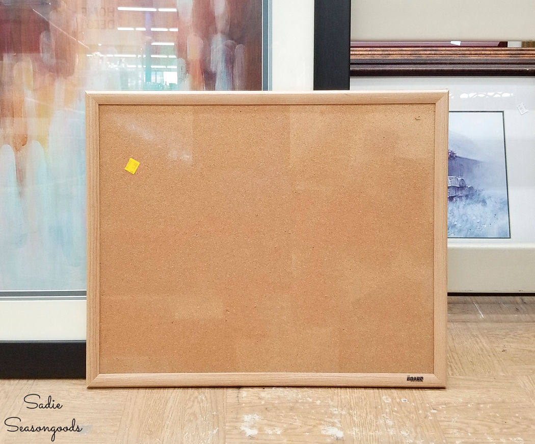 I just can’t seem to help myself when I find these “blah” cork boards while thrifting. They’re SO useful but the plainness is overwhelming. So, it’s no surprise that I truly enjoy sprucing them up; remember this one that I made for my office?