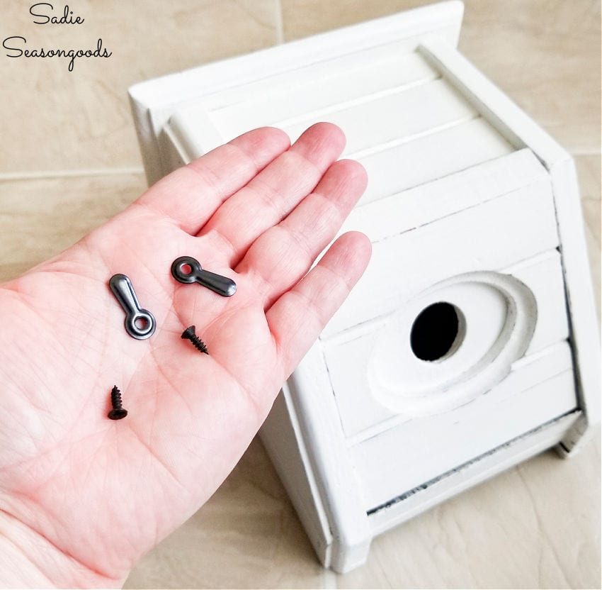 With my drill, I simply screwed them into the frame of the Kleenex box cover, right next to the “door”.
