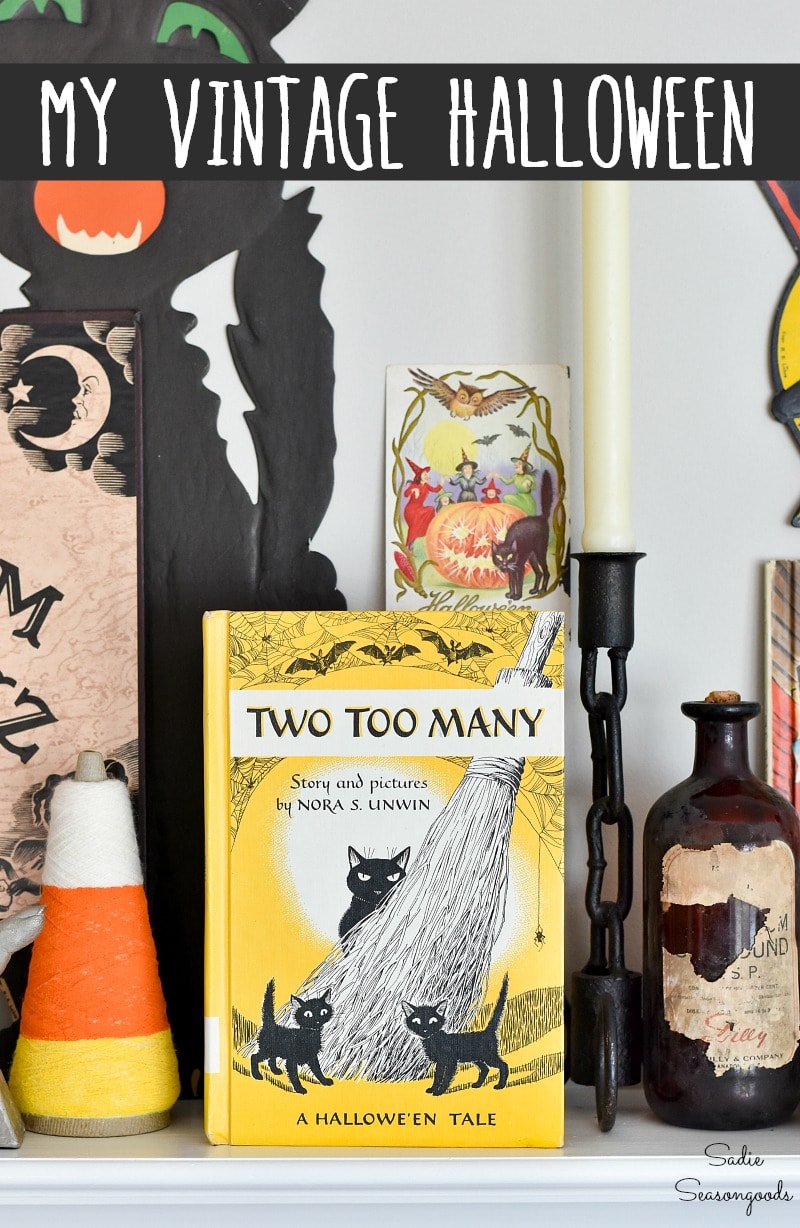 For many years, I didn’t have a lot of vintage Halloween decor. It’s much rarer than vintage Christmas decorations, but I’ve been slowly collecting bits and pieces over the years. But one thing I did have from my childhood was one of my favorite children’s Halloween books. So, I decided to assemble my spooky bits and bobs to use as Halloween mantel decor.