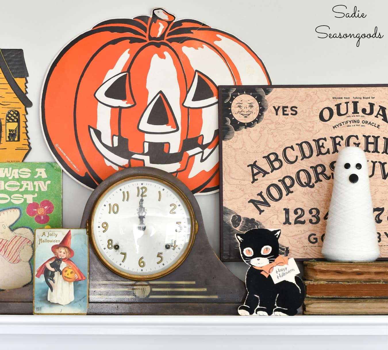 Next, moving towards the center, I used a vintage Ouija board (thrift store find) as the mantel’s centerpiece. It rests in the hinge of a vintage book to keep it from sliding off.