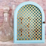 Using gold craft paint, I only stenciled over the rings to transform the wooden lazy Susan into mid century modern decor. I don’t have the skills (or patience) for a real metal inlay, so a stenciled version was just the ticket.